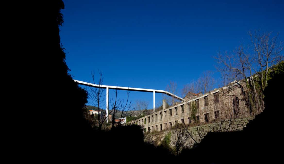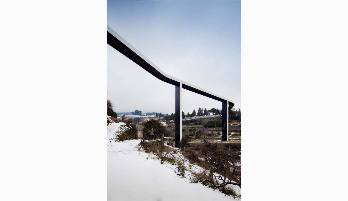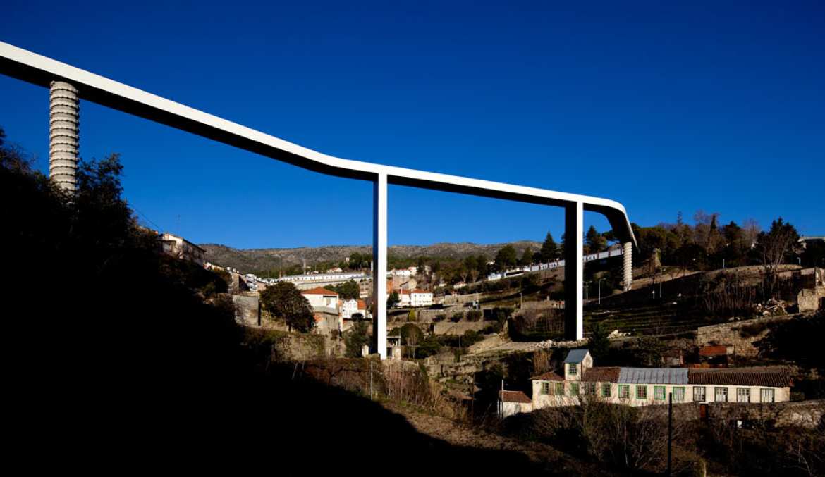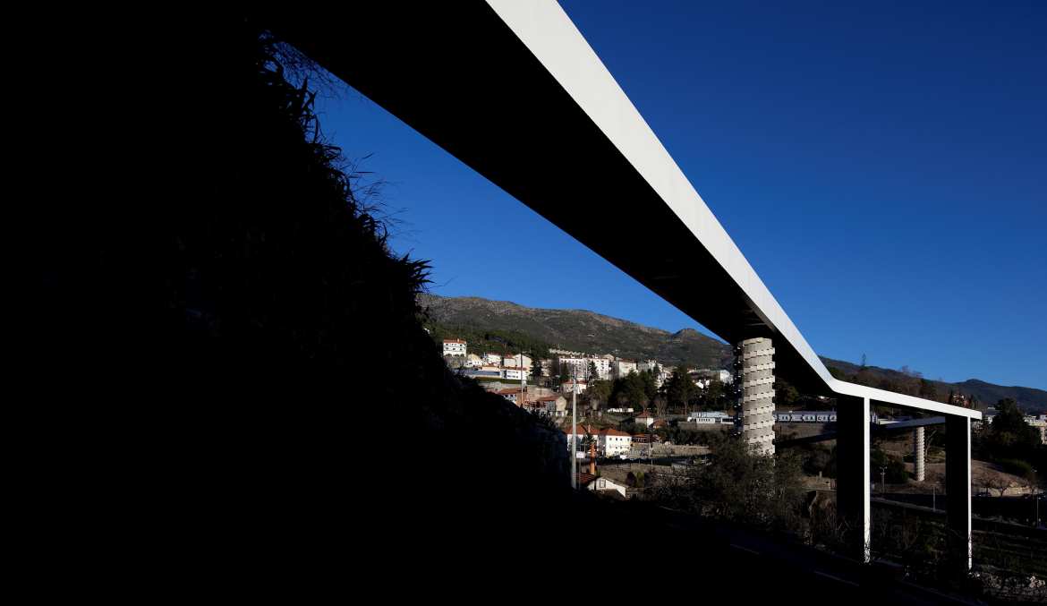 the sinuous and segmented design of the bridge winds above de valley, along a distance of about 220 m. the central takes a path perpendicular to the line of the valley. the other two sections are inflected and oriented towards their anchoring points. the connection between the two points is no longer the shortest distance between them. the tense geometry of its layout interferes with visual orientation and with the perception of dominating heights of “serra da estrela”, on one side, and with the vastness of cova da beira on the other.