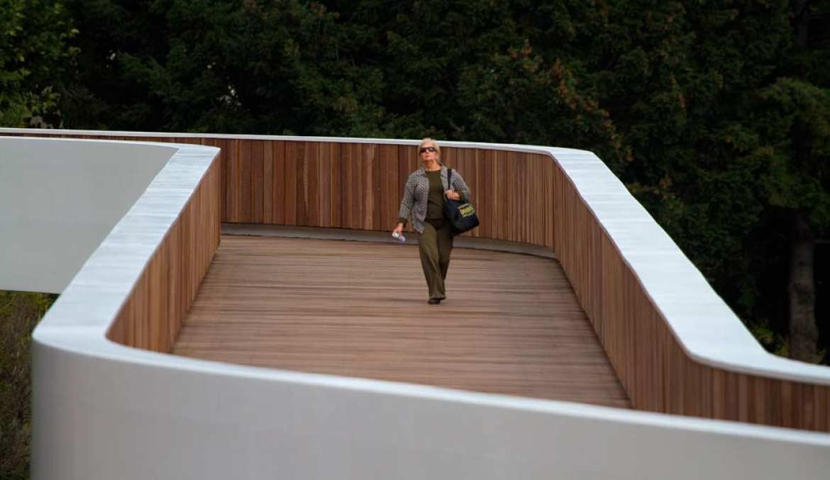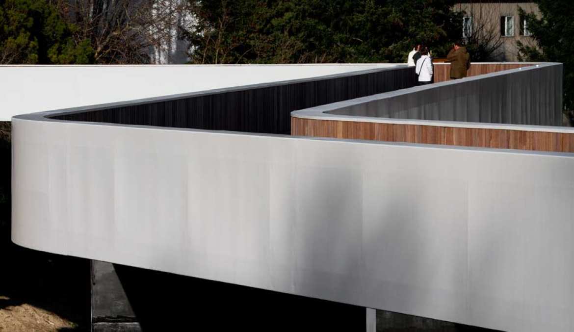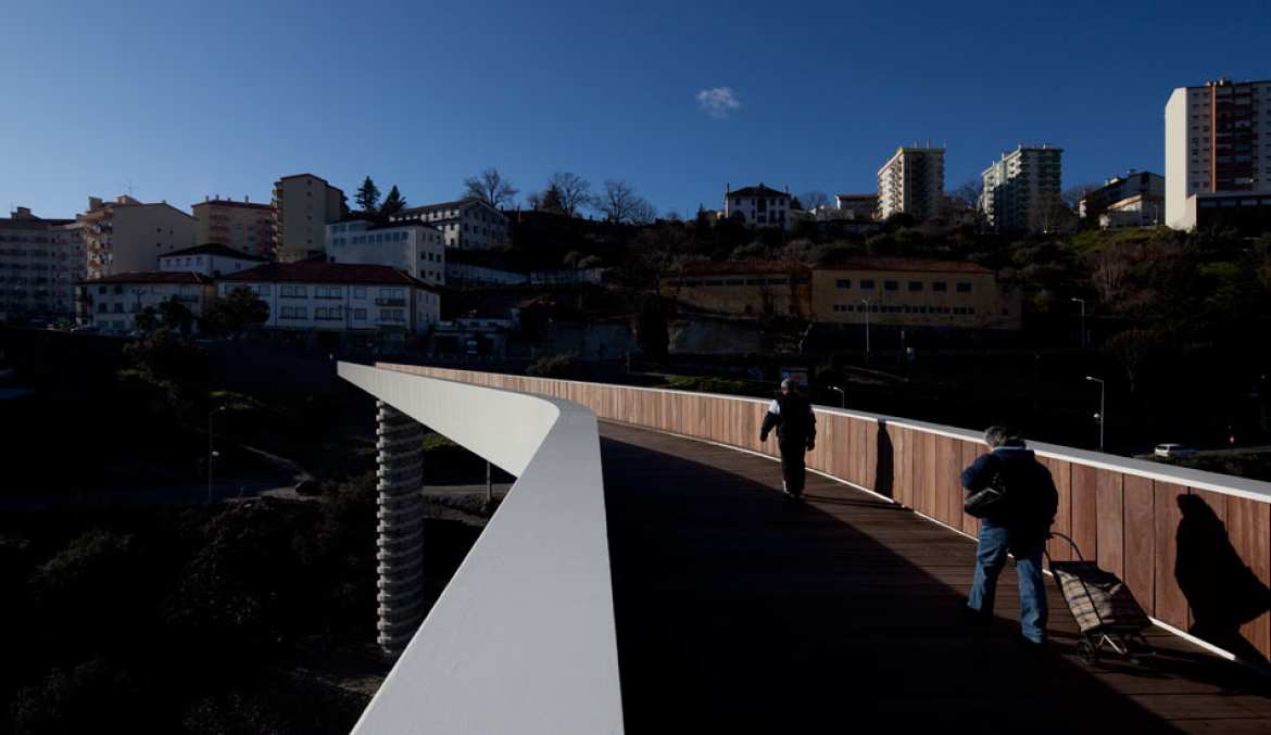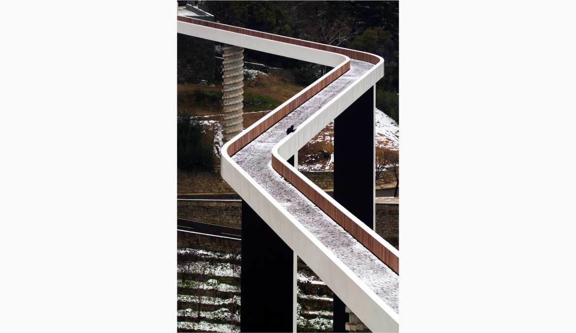 the sinuous and segmented design of the bridge winds above de valley, along a distance of about 220 m. the central takes a path perpendicular to the line of the valley. the other two sections are inflected and oriented towards their anchoring points. the connection between the two points is no longer the shortest distance between them. the tense geometry of its layout interferes with visual orientation and with the perception of dominating heights of “serra da estrela”, on one side, and with the vastness of cova da beira on the other.
