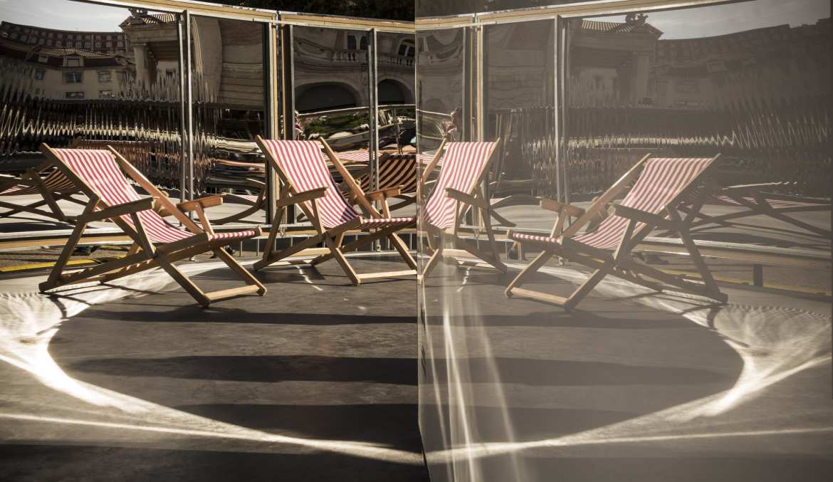 the bar-table, the striped chairs and the tape of leds over the black concrete arena are the only support we have left inside this cursed device.