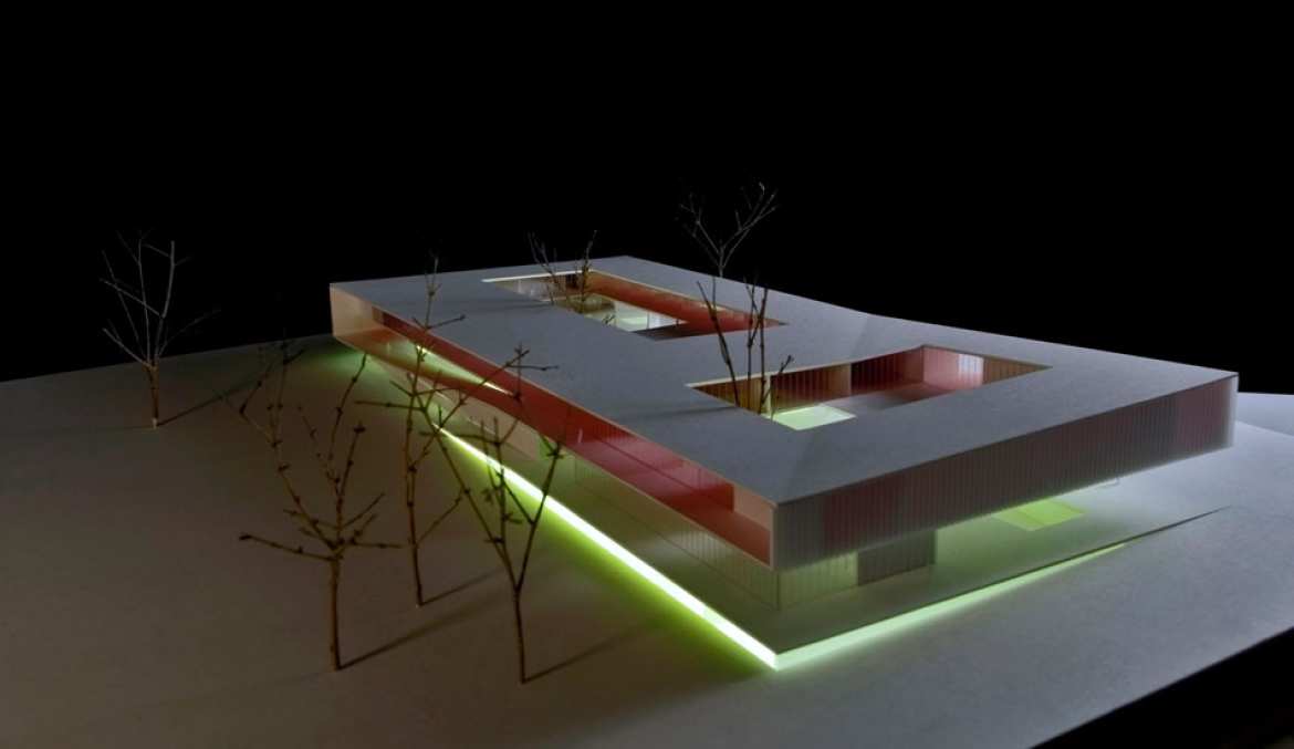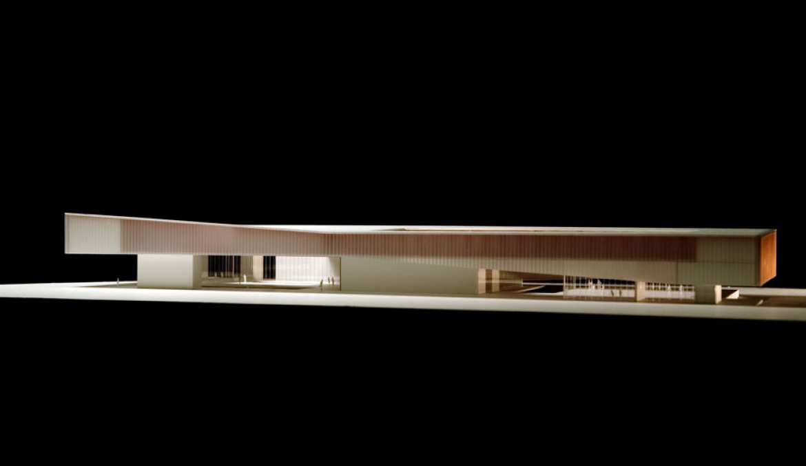 a distorted and crystalline horizontal prism takes on the character of a pavilion in the park. it is organised in three levels: the ground level, very permeable, is occupied, as expected, with the reception and spaces of a more public nature; hovering over is the upper level with the school spaces; the basement contains the exhibition spaces of the museum. a series of patios, stairs and ramps provide the interaction between the different levels, and the accesses, the lighting and event areas.