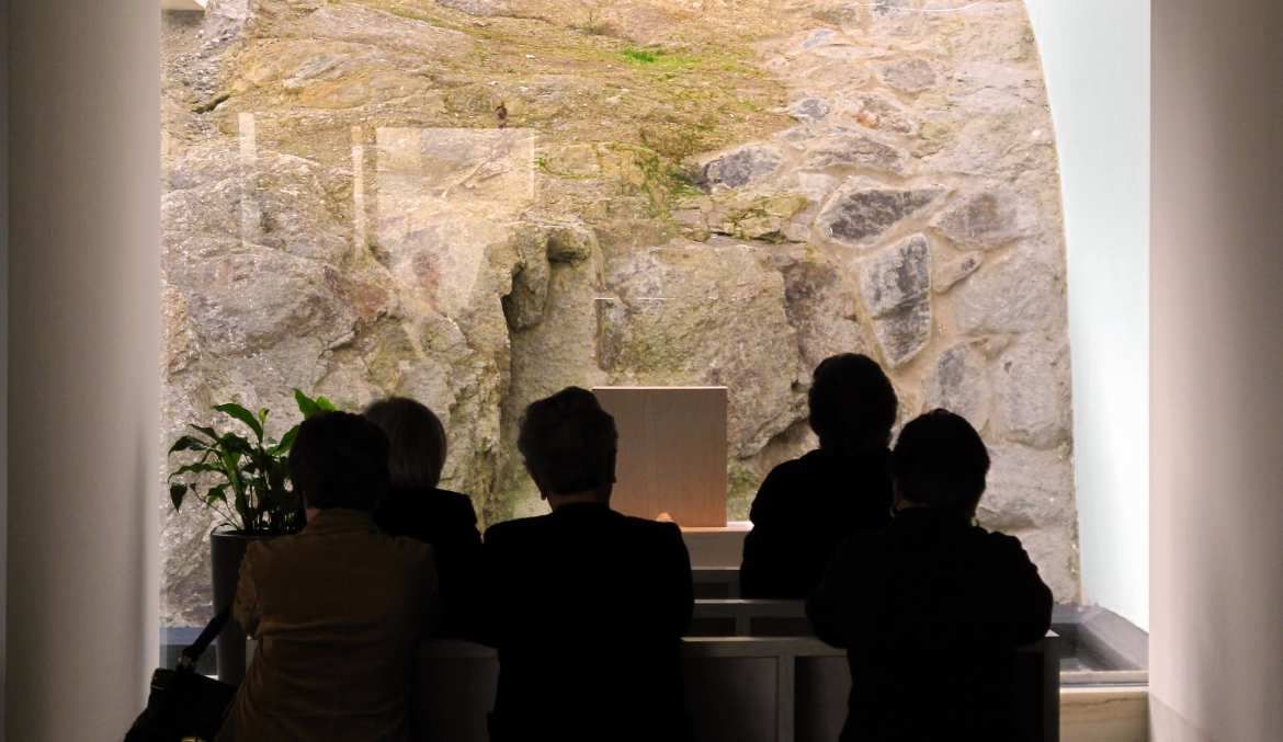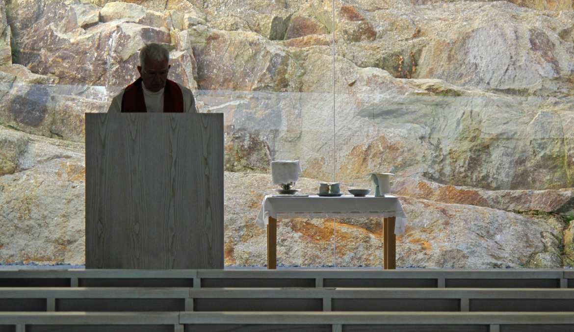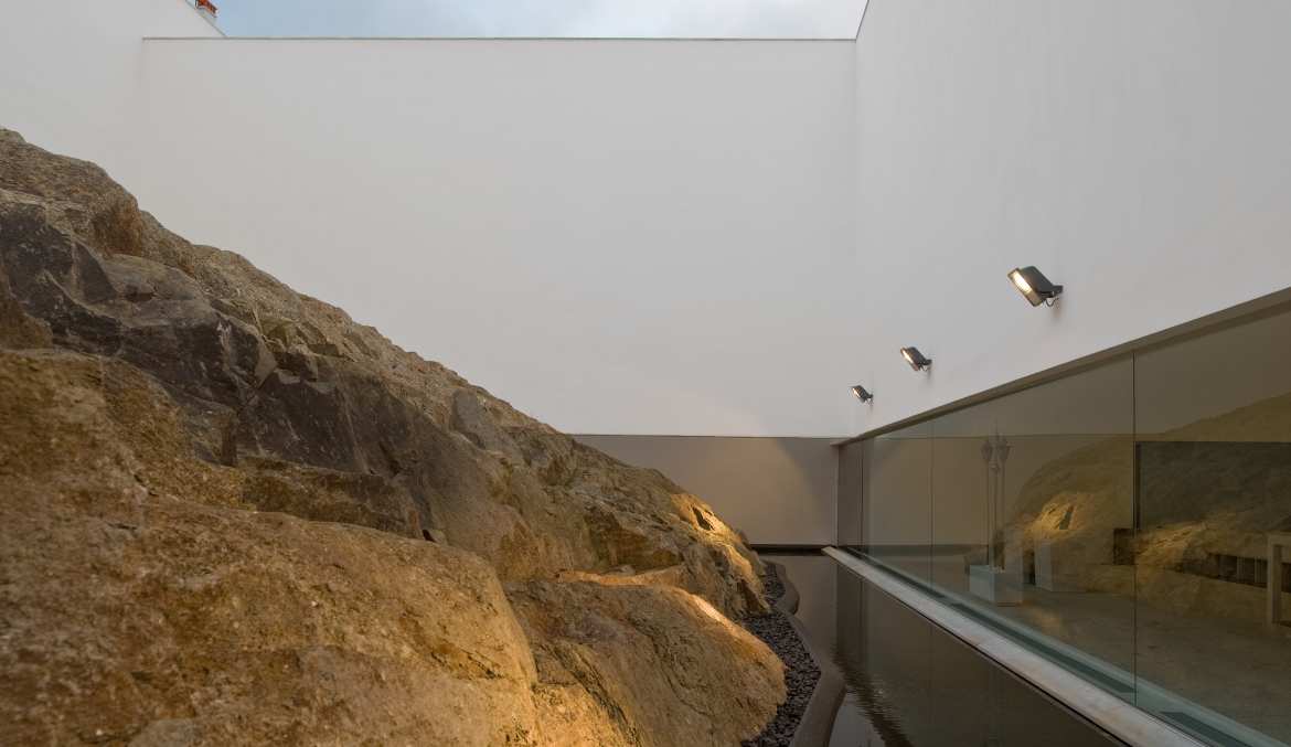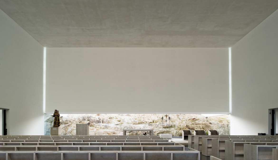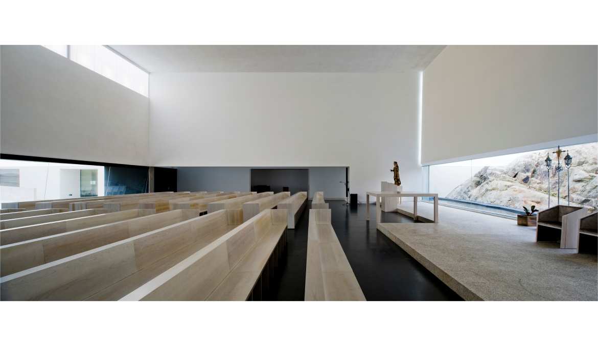 from the outside, this building has an elementary volume composed of white plans. the main space has a longitudinal shape and the road leads visitors to the bare rock of quartz. the entrance-porch faces southwest. then, an atrium flanked by two ramps and the community centre. the central space of the church appears through a transparent glass. finally, an outdoor patio is defined by the existing rock, air, water, light and vegetation, an outdoor area open to contemplation. the extreme simplicity of the place, its language, architecture, design objects and furniture aims to set up a freedom area within which individuals and events are the protagonists.