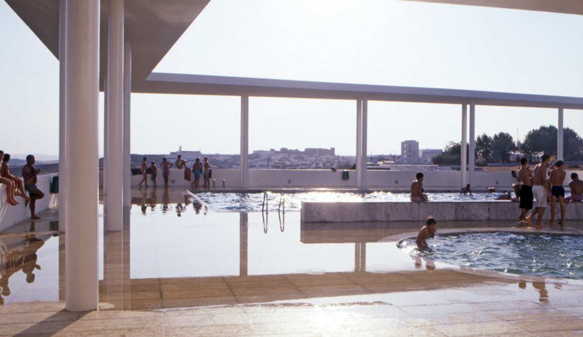 an open-air municipal swimming pool with three uses, one for beginners, one for children, and a cafeteria on the summit of the hill.